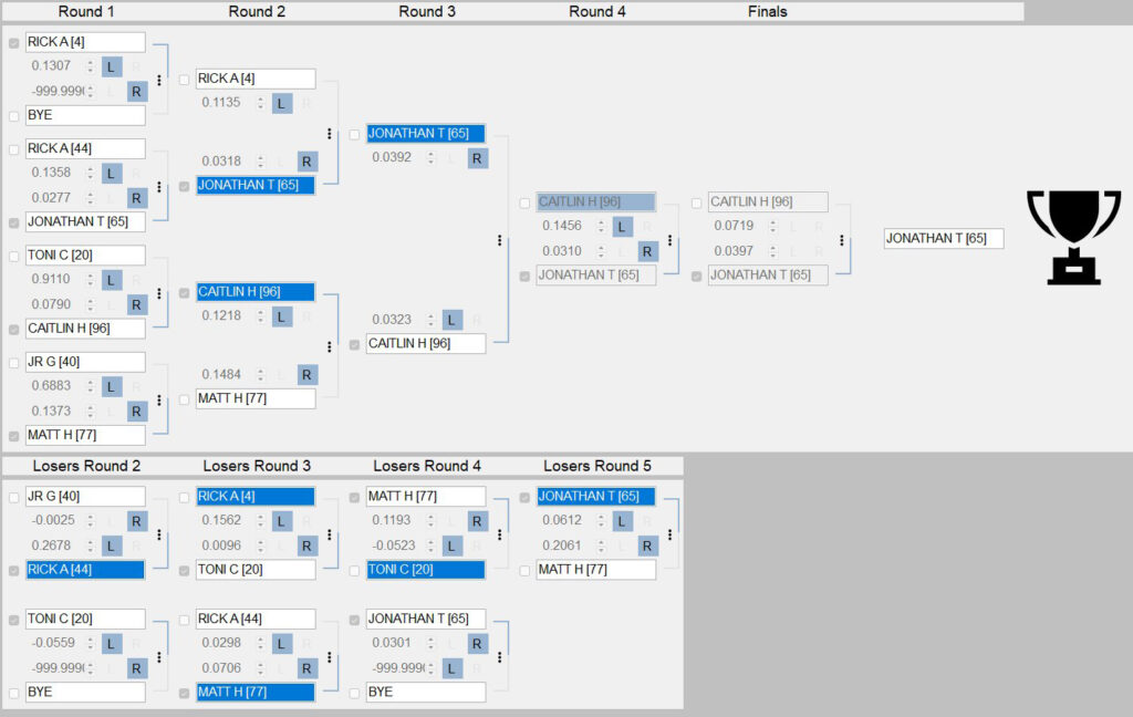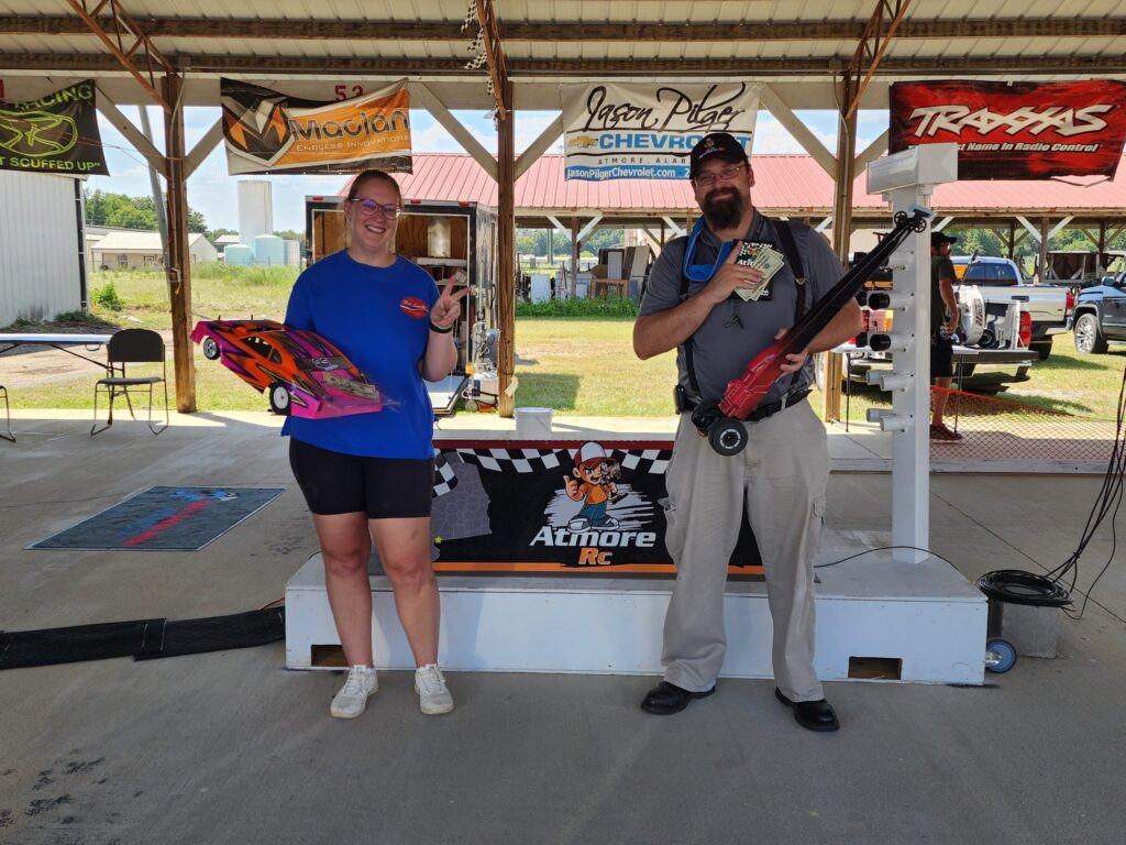 The Open Bracket class sponsored by Emerald Coast Water Heaters & Emerald Coast Custom Rentals had 7 entries. Our points leader Caitlin made her way through the winners’ side taking out Jonathan in the winners’ side finals by a margin of victory of one thousandth of a second. He’d get a shot at revenge after defeating Matt H in the loser’s bracket finals. Jonathan would need to somehow beat Caitlin twice to raise the plaque for the photo, and two holeshot wins barely squeaked by her. She may have lost that battle but she’s still winning the war because she pulled further ahead, extending her points lead to ten.