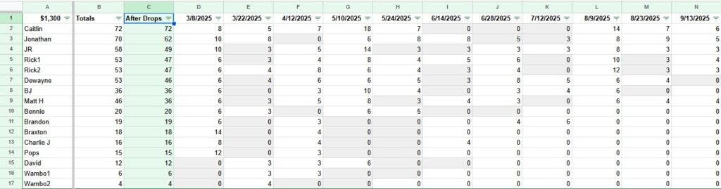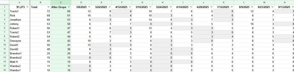 Points Standings (as of 9/14/2025 and factoring in 3 drops)