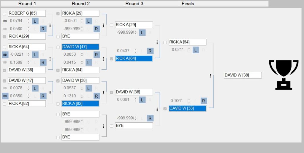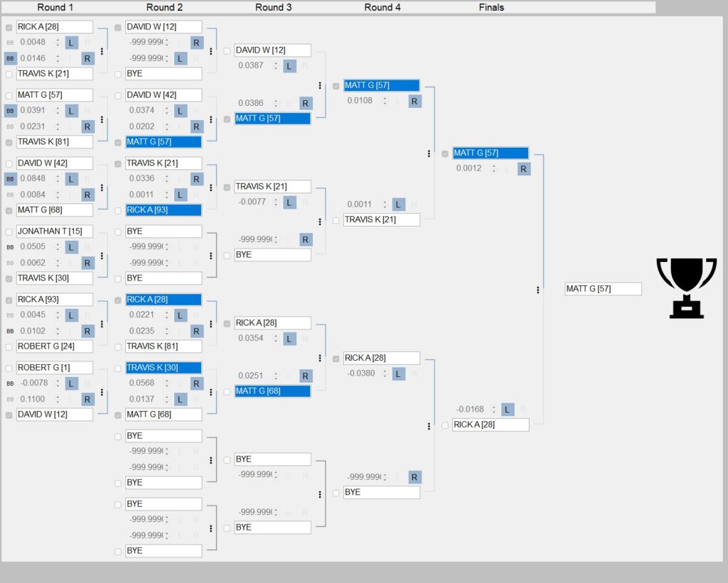 The Pensacola Pool Services Dialin Jackpot had 7 entries. The usual suspects were shooting for the moon, with tiny breakouts taking Matt G (0.0006), Travis (0.0030), and Jonathan (0.0080) out of the running. Robert was leading right up to the end, but David would swoop in to beat him one thousandth of a second and grab the jackpot.