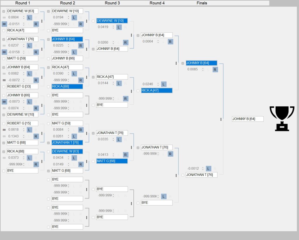 Our bonus class was 2.50 index. There’s wasn’t a ton of interest though. Johnny and Rick battled for a plaque. Rick’s rocket ship ended up in Johnny’s lane round one. Then in the finals (first attempt) Johnny’s body flew off but didn’t hit anything. Rick completed his pass to break out. Neither was happy with the outcome so they decided to rerun. This time Rick would slap the wall giving Johnny the win.