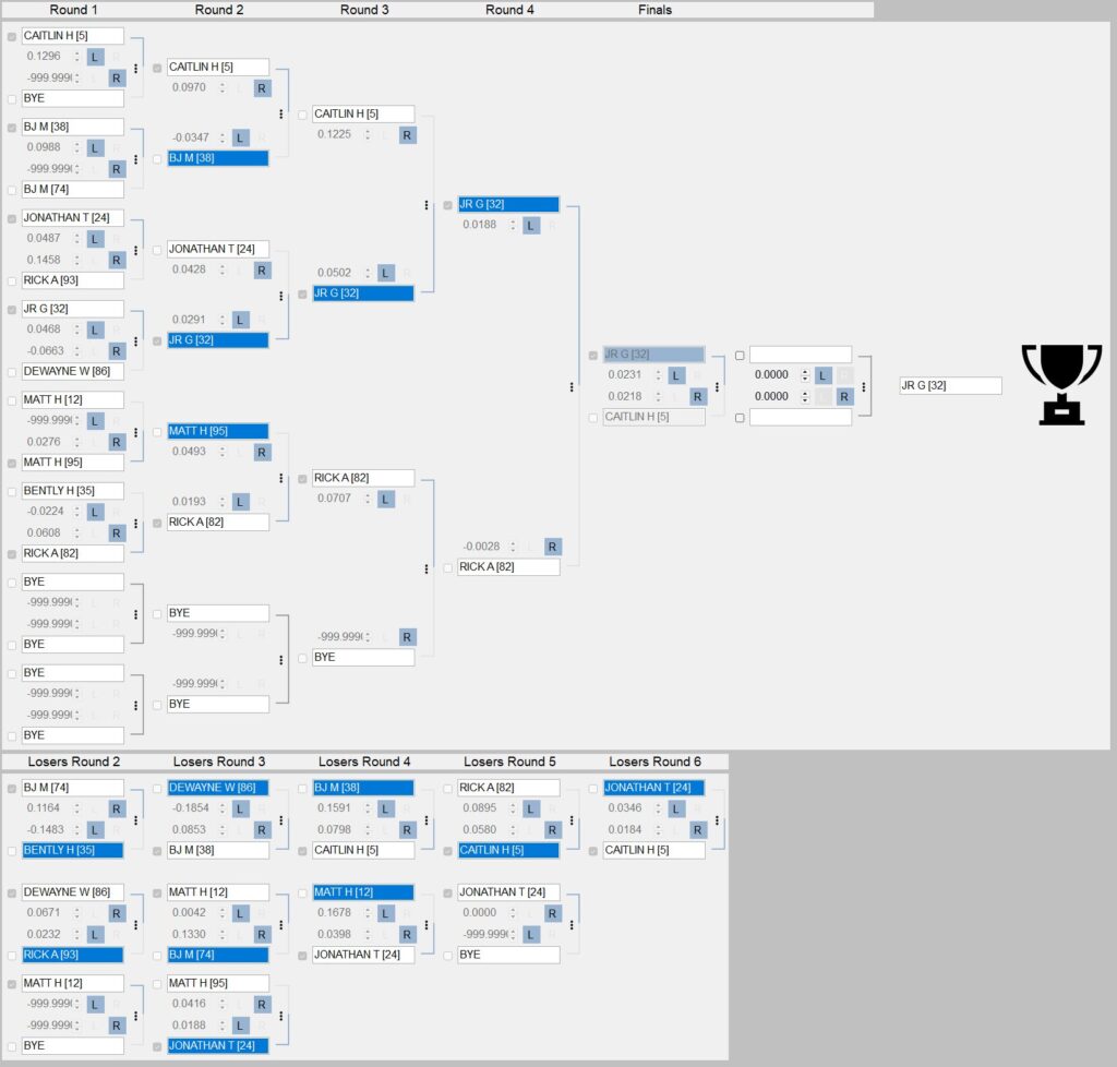 The Open Bracket class sponsored by Emerald Coast Water Heaters & Emerald Coast Custom Rentals had 11 entries. JR was on a war path. He took out second place in points Jonathan second round, then the points leader Caitlin in third round, then fourth place in points Rick fourth round. He then met Caitlin again in the finals after she had battled through the losers bracket. JR ran dead on the dial with a three to seal the deal and hold the plaque high.