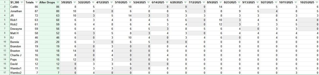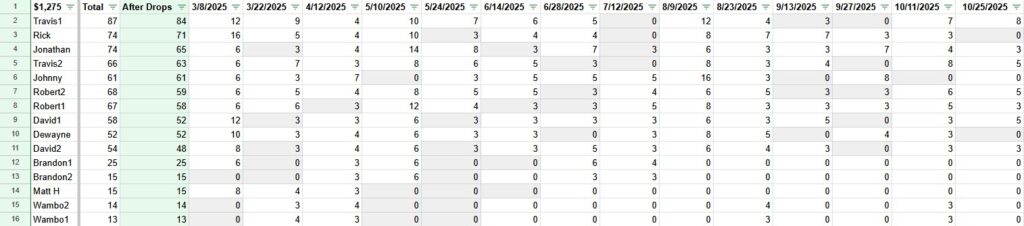 Points Standings (as of 10/26/2025 and factoring in 3 drops)