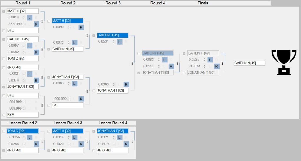 The Open Bracket class sponsored by Emerald Coast Water Heaters & Emerald Coast Custom Rentals only had 5 entries. Caitlin went the distance on the winners’ side, beating Jonathan in the finals there. Jonathan got another shot after winning the losers side, but Caitlin had his number and would be the victor of the day. She extended her points lead by a point.