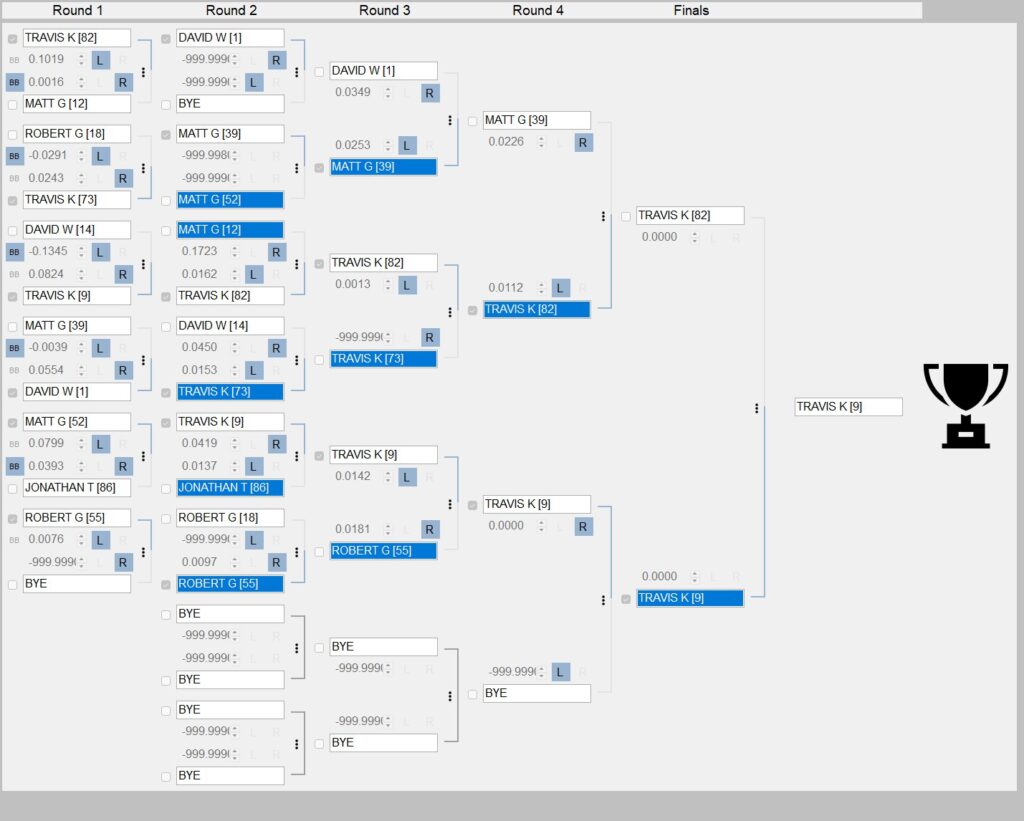 The Pensacola Pool Services Dialin Jackpot saw Travis take the early lead running dead on with a eight. MattG and MattH would break out by a couple thou each, barely missing their opportunity. Jonathan grabbed the jackpot running dead on with a four.